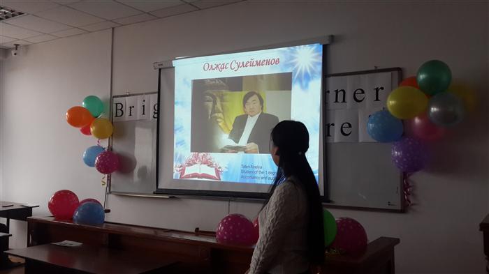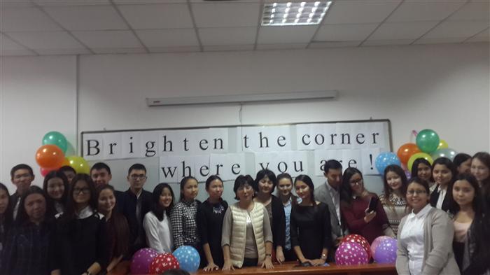 19.11.2015 в 405 ауд. был проведен с Карашиной Г.Т. и Артыковой Е. в рамках проекта "Айналаңды нұрландыр" мероприятие, посвященное международному дню студентов. На конференции студенты выступили с докладами о знаменитых выпускниках нашего ВУЗа. Были показаны слайды. Члены любителей клуба английской песни выступили с концертом. Все участники исполнили гимн студентов «Гаудеамус».