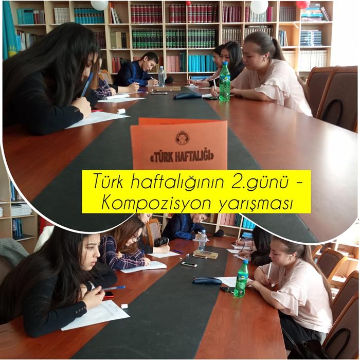 На втором дне недели турецкого языка, в 12 марта, 2019 г. был проведен конкурс на написание эссе на турецком языке с целью улучшения навыков письма среди студентов 1-3 курса. Студенты должны были выразить свои мысли на разные темы, такие как «Vatan sevgisi», «Milli bayramlar», «Gençlik hayalleri», «İnsanlık ölmüş mü?», «Bir dünya hayal ediyorum?», «Keşke olsaydı/olmasaydı...», «Kazakistan'da genç olmak?», «Doğa bize neler söylüyor?», «Eğer şimdi uyuyakalırsan rüya göreceksin, Eğer şimdi çalışırsan rüyanı yaşayacaksın.», «Elinde sihirli bir değnek olsaydı, ne değiştirirdin?». По результатам конкурса 1-е место заняла Иземова Асель, 2-е – Естемис Асем, третье – студентка 1-го курса Нияхаджиева Шахсанам. Обладатели призов были награждены дипломами и подарками от имени кафедры и организаторов.