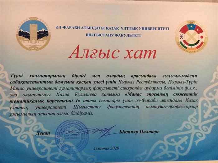 В пятницу 11 декабря 2020 г., на кафедре Тюрксой и научно-исследовательском центре «Памятники письменности и духовного наследия» факультета востоковедения Казахского национального университета им. Аль-Фараби, под модераторством перподавателя Кутлугжона Султанабек, в дистанционном режиме прошел традиционный, третий семинар на тему «Сюжетно-тематический указатель І эпоса Манас» с к.ф.н., старшим преподавателем Кыргызско-Турецкого университета Манас Калией Кулалиевой.