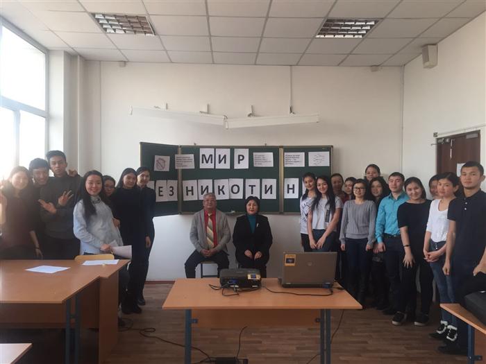Профессор кафедры ДУиТУ Жунусова Ж.Х. в рамках проекта «Культ здорового тела» со студентами механико-математического факультета группы ИС-14-04, ММ-14-2А,Б проводила открытый круглый стол «Не прокури свое здоровье»