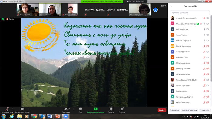 Участники мероприятия декламировали стихи о Казахстане на казахском, русском, английском, китайском языках, представляли видео ролики к исполняемым песням о Родине. Все это еще больше обогатило литературно-музыкальную композицию патриотичностью, выраженной в музыкальном искусстве казахского народа.