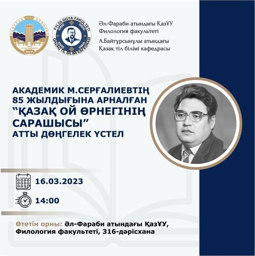 16 марта кафедрой казахского языкознания им. А. Байтурсынова был организован круглый стол "Казак ой өрнегінің сарашысы", посвященный 85-летию академика М. Сергалиева!