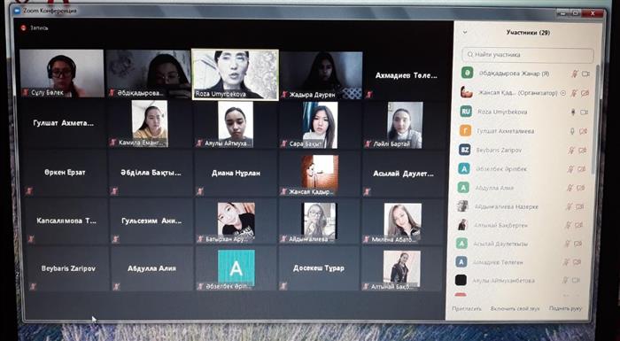 15 декабря ко Дню Независимости со Студентами 4-курса специальности Казахская филология и эдвайзером группы Гулшат Уабиденовной был проведен открытый урок на платформе ZOOM «Қасіретім, ар-намысым, мақтанышым-Желтоксан». Открытый урок прошел с участием кандидата филологических наук, старшего преподавателя Умирбековой Розы Калдыбековны. Были проведены поучительные беседы, показаны видео, прочитаны стихи, посвященные «Желтоқсан желі».