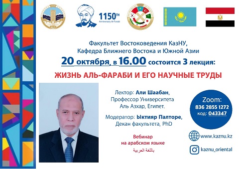 Кафедра Ближнего Востока и Южной Азии факультета востоковедения КазНУ им.Аль-Фараби предлагает встречу с участием зарубежных профессоров в рамках «Лидерских лекций» для преподавателей арабского языка, докторантов и магистрантов. 20 октября в 16.00 состоится вебинар в онлайн формате с профессором факультета иностранных языков и переводческого дела университета Аль-Азхар Али Али Шаабан. Тема вебинара "Жизнь и научные труды Аль-Фараби". Посследование данных встреч будет продолжено специалистами арабского языка, Фарабистами и востоковедами в Саудовской Аравии, Египта и Марокко.