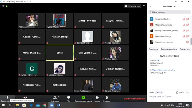 21 апреля текущего года на платформе Zoom проведено совместное воспитательное мероприятие в рамках проекта «Айналаңды нұрландыр» на тему: «Ұлт болашағы жастардың қолында» с участием студентов КазНУ имени аль-Фараби и МКТУ имени Х.А.Яссави.