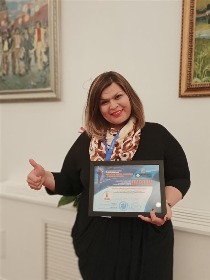 В 29 ноября 2019 года в рамках III республиканского конгресса по остеопорозу с международным участием участвовала с научной работой на тему « Влияние ингибиторов фактора некроза опухоли-а на минеральную плотность кости пациентов с аксиальной формой анкилозирующего спондилита», которая была выделена и оценена российскими учеными в данной области как проф. Баранова И.А., проф. Громова О.А. и присуждено 2-ое почетное место. В 30.11.2019 года по окончании конгресса участники были награждены с дипломами и денежными призами из рук самого президента ассоциации врачей по остеопорозу, профессора Лесняк О.М.