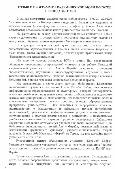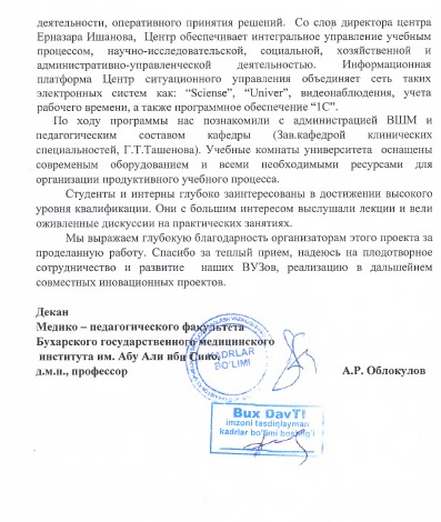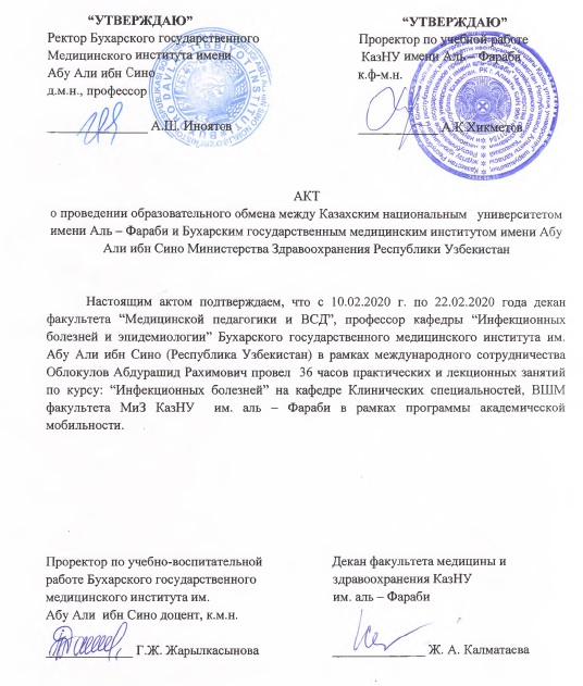Образовательный обмена между Казахским национальным университетом имени Аль - Фараби и Бухарским государственным медицинским институтом имени Абу Али ибн Сино Министерства Здравоохранения Республики Узбекистан |
