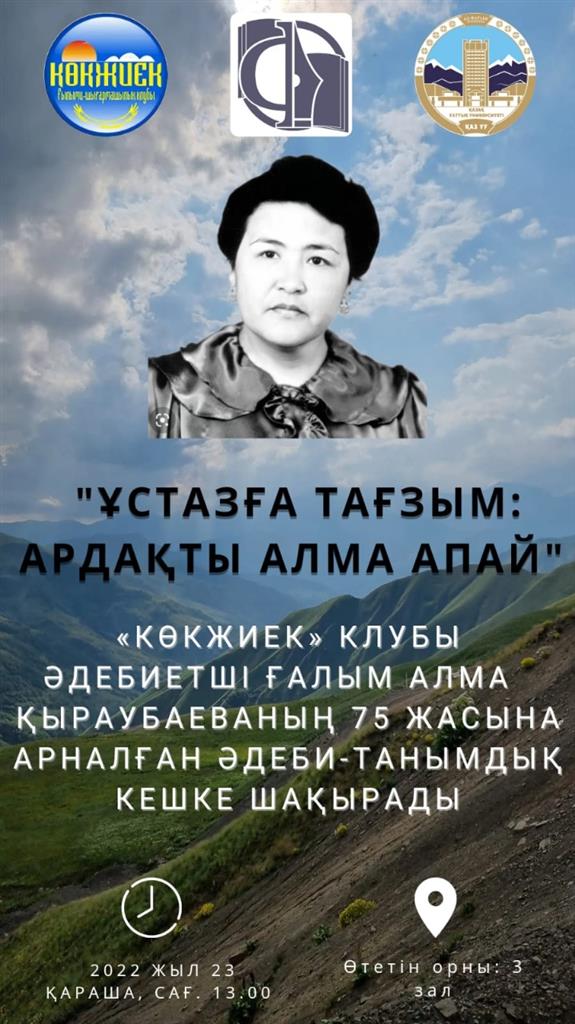 Научно-творческий клуб «КӨКЖИЕК» филологического факультета приглашает на литературно-познавательный вечер, посвященный 75-летию известного литературоведа, педагога Алмы Муталипкызы Краубаевой (по книгам «Ғасырлар мұрасы», «Жаным садаға»)