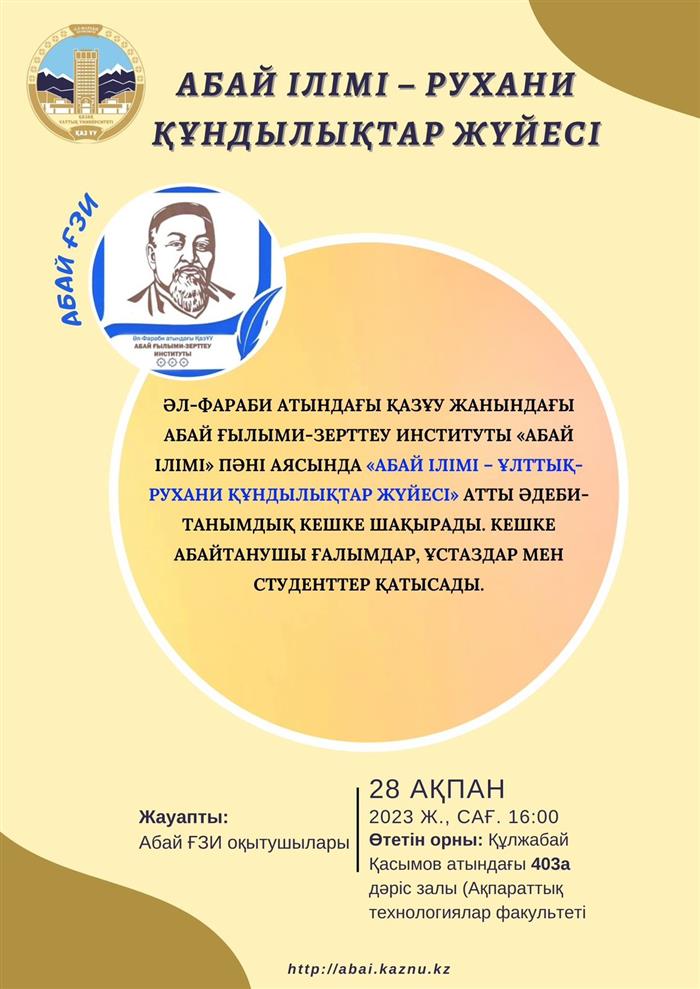 Научно-исследовательский институт Абай при КазНУ имени аль-Фараби приглашает на литературно-познательный вечер «УЧЕНИЕ АБАЯ – СИСТЕМА ДУХОВНЫХ ЦЕННОСТЕЙ» в рамках предмета «УЧЕНИЕ АБАЯ».