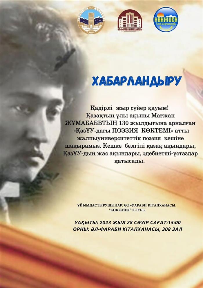 Научно-творческий клуб «КӨКЖИЕК» факультет и библиотека аль-Фараби приглашает на общеуниверситетский вечер поэзии «ВЕСНА ПОЭЗИИ В КазГУ» посвященный 130-летию великого казахского поэта Магжан ЖУМАБАЕВА. Гости вечера – известные казахские поэты, преподаватели факультета филологии и журналистики. На мероприятии состоится поэтическое состязание молодых поэтов.