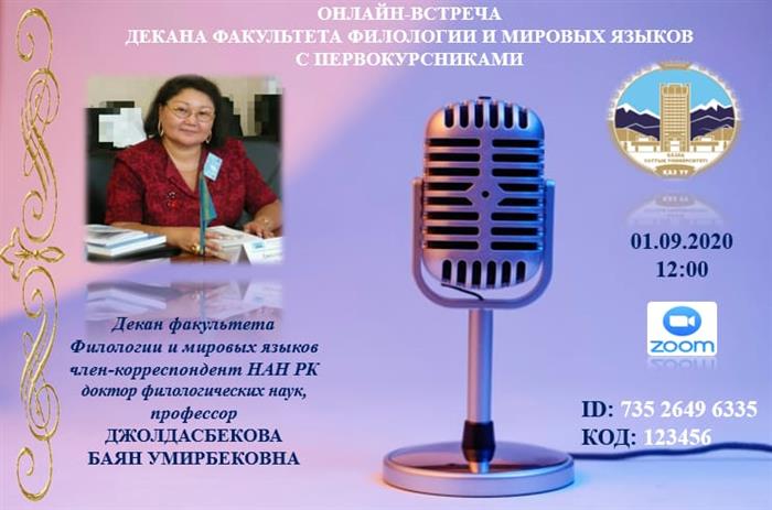 Факультет филологии и мировых языков приглашает вас на запланированную конференцию: Zoom Тема: Онлайн-встреча декана факультета филологии и мировых языков со студентами 1 курса Время: 1 сентября 2020 года 12:00 PM Алматы Подключиться к конференции Zoom по ссылке: https://us04web.zoom.us/j/73526496335?pwd=U0pjWGlDVWJnWDhSb2c0anR2NjJlUT09 Идентификатор конференции: 735 2649 6335 Код доступа: 123456 |