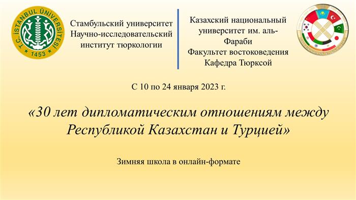 Зимняя школа организована кафедрой Тюрксой факультета востоковедения КазНУ им. аль-Фараби совместно со Стамбульским университетом Турция для студентов, магистрантов и докторантов, обучающихся в «Научно-исследовательском институте тюркологии» с 10 по 24 января 2023 года на тему «30 лет дипломатическим отношениям между Республикой Казахстан и Турецкой республикой» в режиме онлайн.