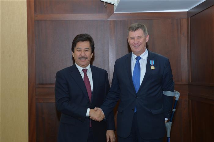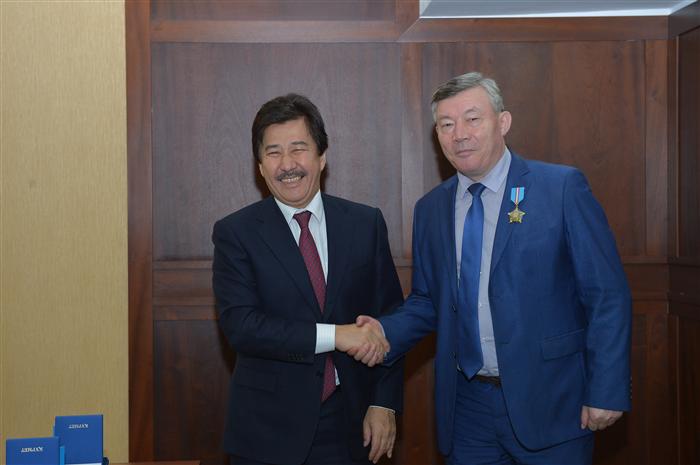 В торжественной обстановке на ректорате орденом «Парасат» были награждены директор Института проблем горения, лауреат Государственной премии РК профессор Зулхаир Мансуров и орденами «Құрмет» - заслуженный тренер РК Анатолий Арещенко, профессор Берекет Карибаев и доцент Архат Абикенов.