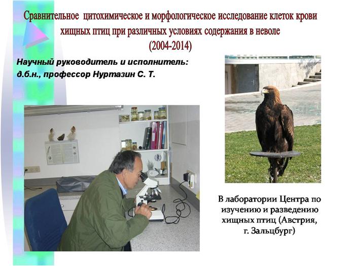 Международный грант с Центром изучения и разведения хищных птиц Австрийской республики «Сравнительное цитохимическое и морфометрическое исследование клеток крови хищных птиц при различных условиях содержания в неволе».