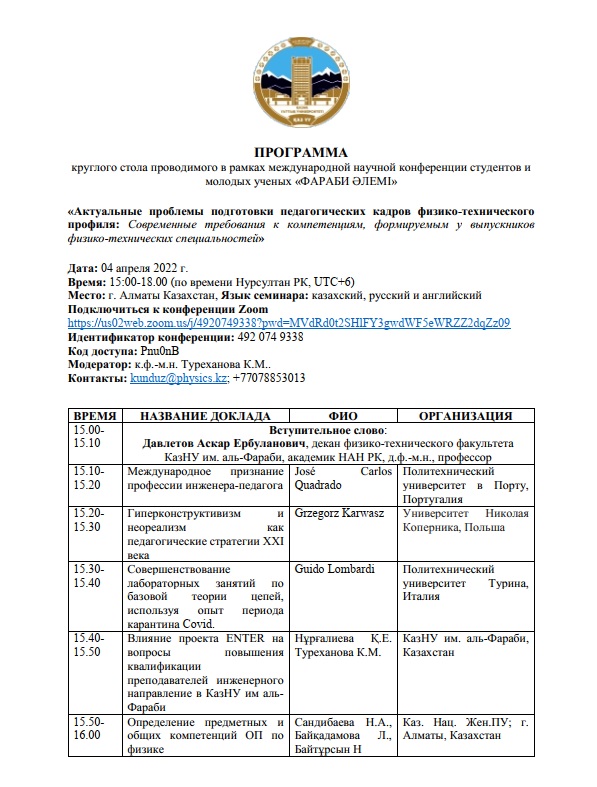 С участием преподаватели кафедры: Коданова С.К., Габдуллина Г.Л., Нургалиева К.Е., Габдуллина А.Т., Туреханова К.М. 4 апреля 2022 г. прошел Круглый стол в рамках Международной научной конференции студентов и молодых ученых «ФАРАБИ ӘЛЕМІ». Программа.pdf