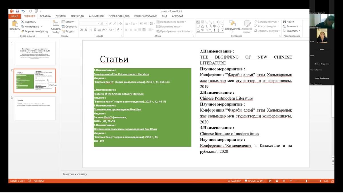 16.01.202310 января 2023 года в онлайн-формате состоялась встреча декана факультета Востоковедения КазНУ им. аль-Фараби с докторантами. Встреча была открыта словами декана факультета кандидата исторических наук, доцента Ем Натальи Борисовны. На встрече были обсуждены вопросы научной-исследовательской стажировки и академической мобильности, и вопросы их финансирования, договоров процесс работы с научными руководителямии заключения меморандумов и т.д.