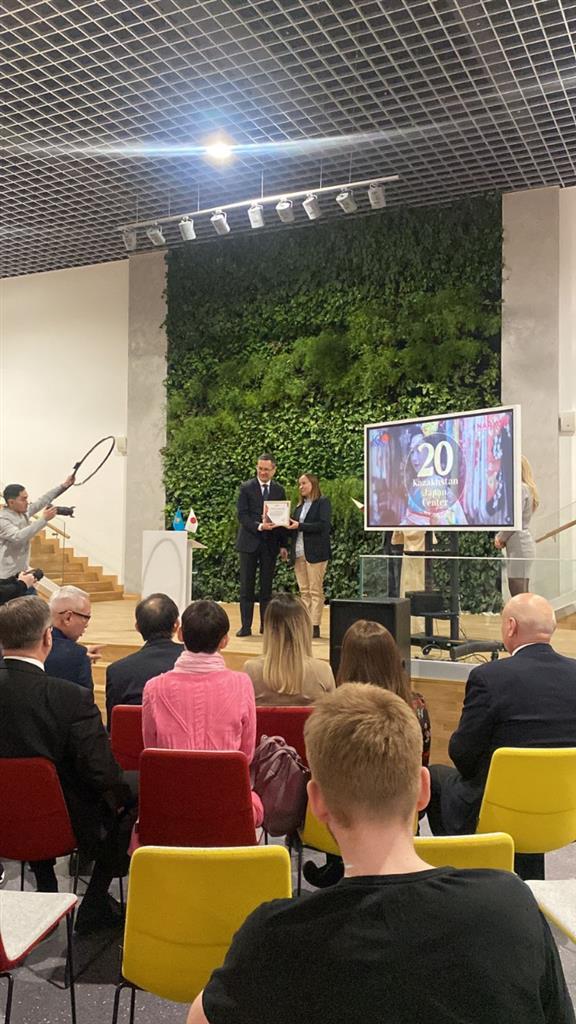 Недавно ведущий преподаватель японского отделения кафедры Дальнего Востока Самал Боранкулова приняла участие в церемонии, посвященной 20-летию основания Казахстанско-японского центра развития человеческих ресурсов (KJC), которая открылась в 2002 году на базе Университета Нархоз как уникальный проект японского правительственного агентства JICA, и получила благодарственное письмо.