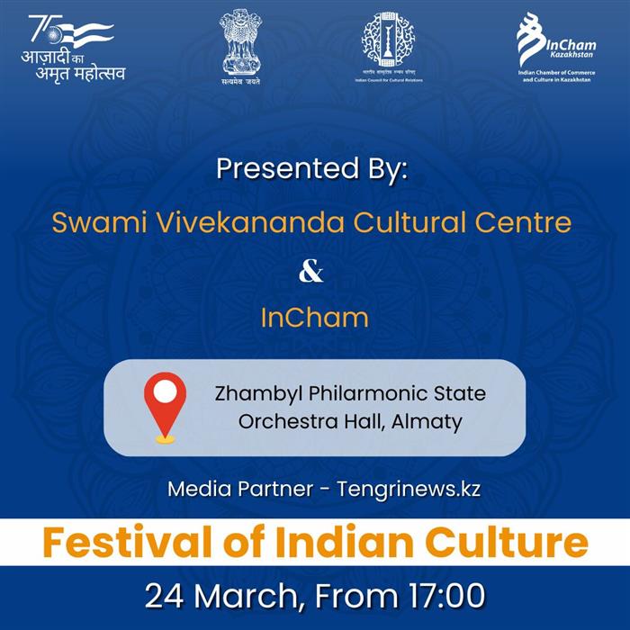 Уважаемые преподаватели и студенты КазНУ им. аль-Фараби! Кафедра Ближнего Востока и Южной Азии факультета Востоковедения приглашает Вас на фестиваль и концерт индийской культуры, организованный Индийским культурным центром имени Свами Вивекананды, Посольством Республики Индия в Республике Казахстан 24 марта 2023 года в 17:00 по адресу г. Алматы Концертный зал филармонии им. Жамбыла!