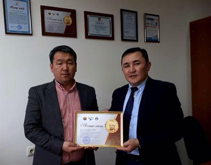 Today the lecturer of Turksoy department of the faculty of Oriental Studies of al-Farabi KazNU Nurat Kulymbetuly Ilias was awarded with a letter of gradititude from the rector of the KazNU academician Galimkair Mutanov. Nurat Kulymbetuly translated from Turkish into Kazakh a documentary film "al-Farabi is the thinker of civilization" about the scientist Abu Nasir al-Farabi. Academician G.Mutanov and professor Zh.Altaev were consultants for the film, which was shot in conjunction with the International cultural center of Istanbul "Medar", the administration of Eskeshehir, "Turkish airlines", Anadolu university and KazNU under the guidance of doctor, professor Bekir Karlygi. A very informative and impressive film will soon be on screens. It was not easy to translate a philosophical film in such a short time. We congratulate our colleague Nurat Kulymbetuly and wish him success in his future work!