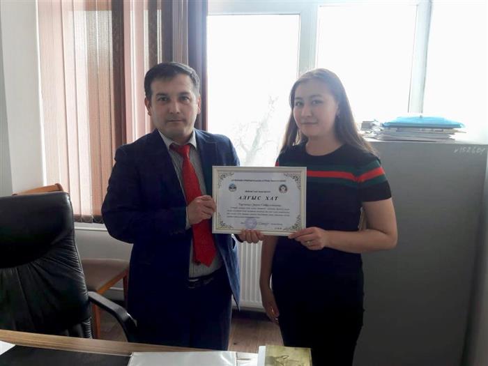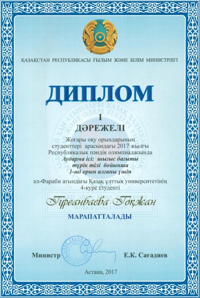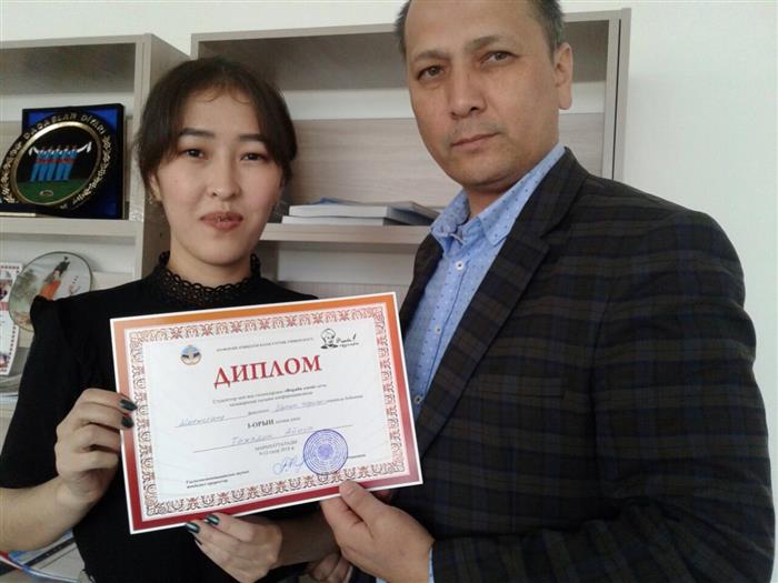 Tokpulatov Davlat, 4th-year student at the KazNU named after Al-Farabi, was awarded a 3rd Degree Diploma by participating at the Republican Olympiad 2017 among students. |