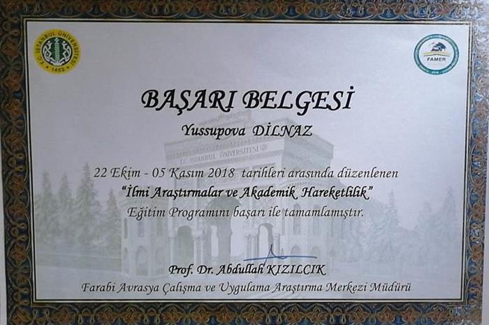 Certificate of Achievement of Yusupova Dilnaz for successfully completing "the Scientific Research and Academic Mobility" training program held between 22 October-5 November 2018. |
