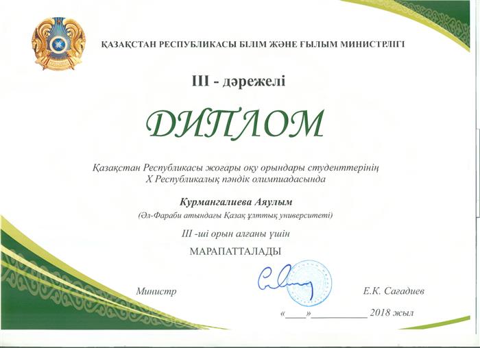 Kurmangaliyeva Ayaulim, a student of the KazNU named after Al-Farabi, was awarded a 3rd Degree Diploma by participating at the Republican Olympiad 2018 among students. |