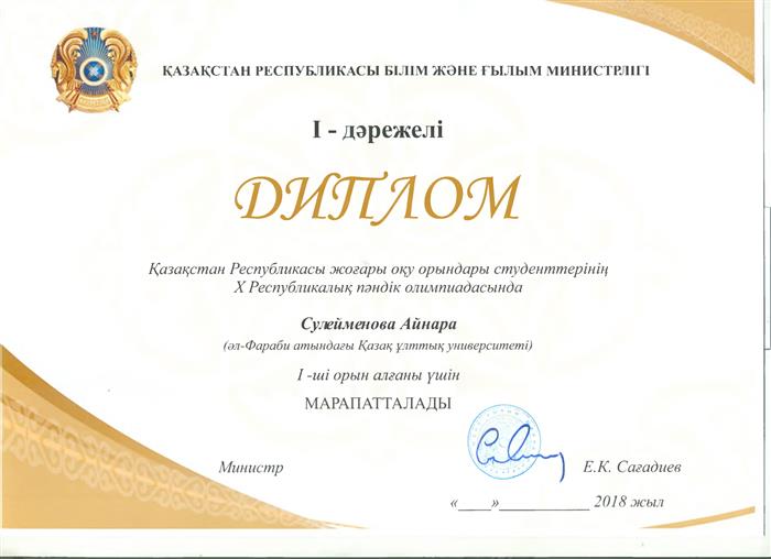 Suleimenova Ainara, 3rd-year student at the KazNU named after Al-Farabi, was awarded a 1st Degree Diploma by participating at the Republican Olympiad 2018 among students. |