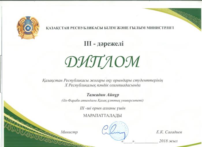 Tazhadin Ainur, a student of the KazNU named after Al-Farabi, was awarded a 3rd Degree Diploma by participating at the Republican Olympiad 2018 among students. |