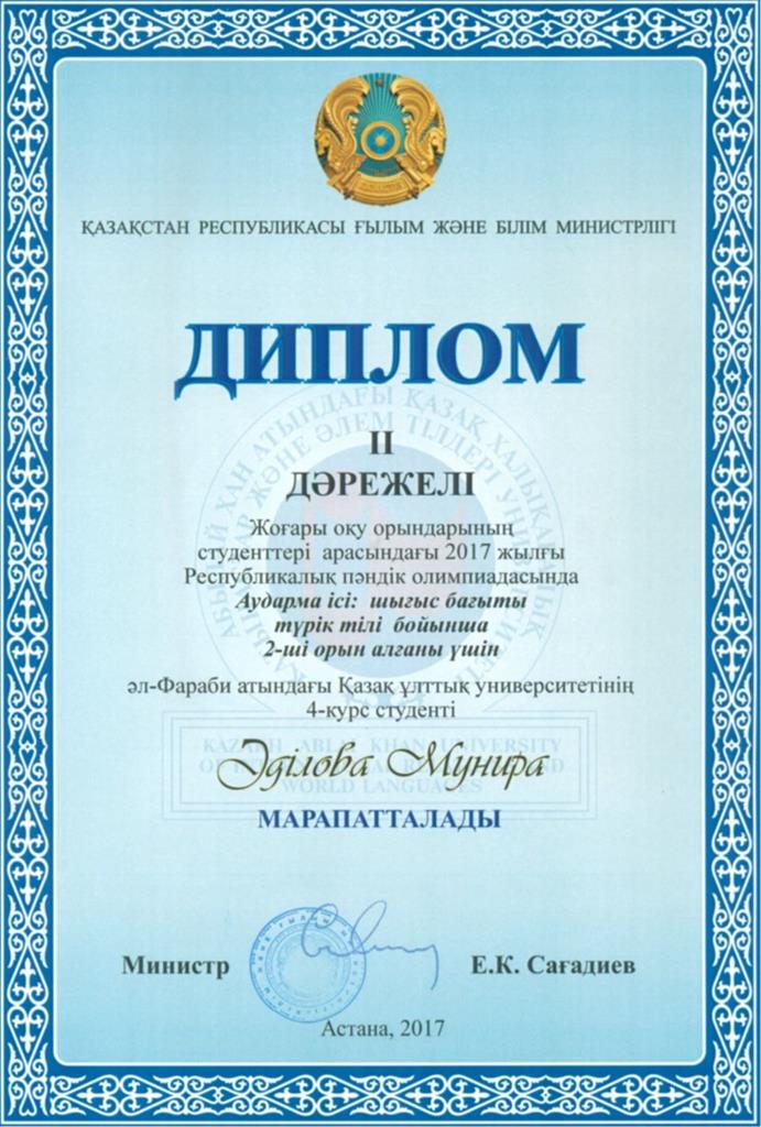 4th year student of Al-Farabi KazNU, Adilova Munira was awarded a Diploma of II Degree in the Republican Olympiad 2017 held among students. |