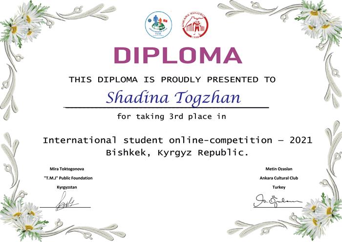 The 1st year student of the Faculty of Information Technologies, Shadina Togzhan took 3rd place in the international competition "International student online-competition" organized by the Republic of Turkey together with the Kyrgyz Republic, which was held online on March 20, 2021. The competition was organized by Metin Ozaslan, the director of cultural association “Ankara Club” (Turkey) and the director of the music association “Tagdyr. Mezgil. Zhasho ”(Kyrgyzstan) Mira Toktogonova |