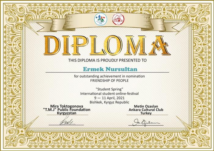 The 1st year student of the Faculty of Information Technology, specialty "Computer Science" Ermek Nursultan nominated "Friendship of People" at the international festival "Student spring" organized by the Republic of Turkey, which was held online 09.04-11.04. 2021 year. |