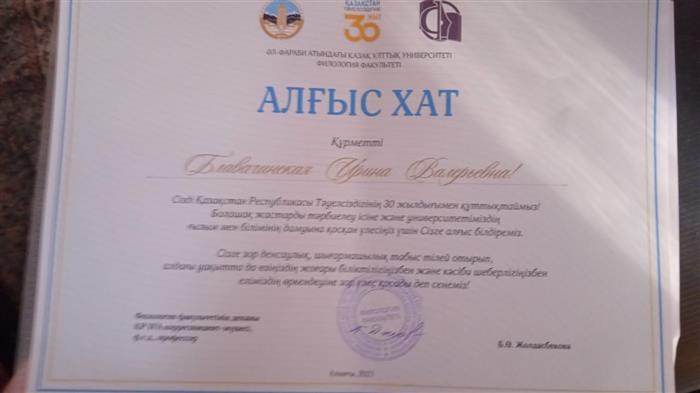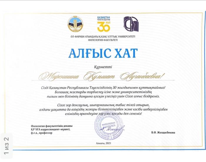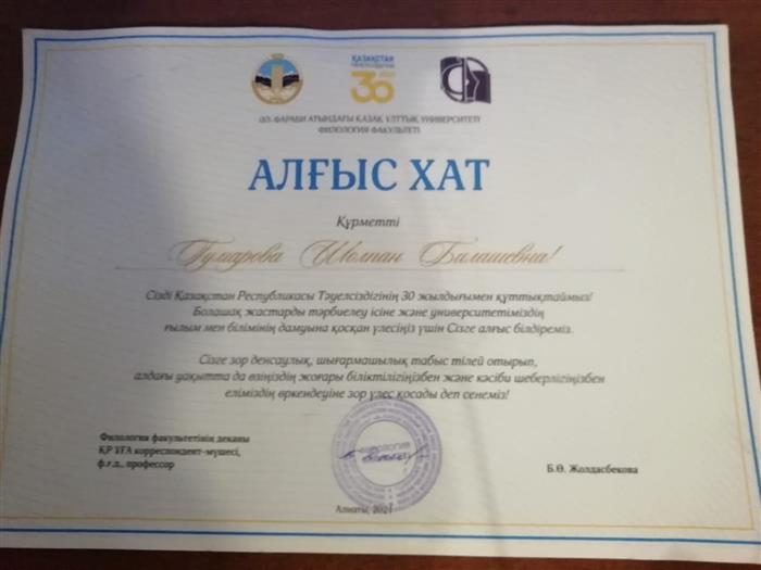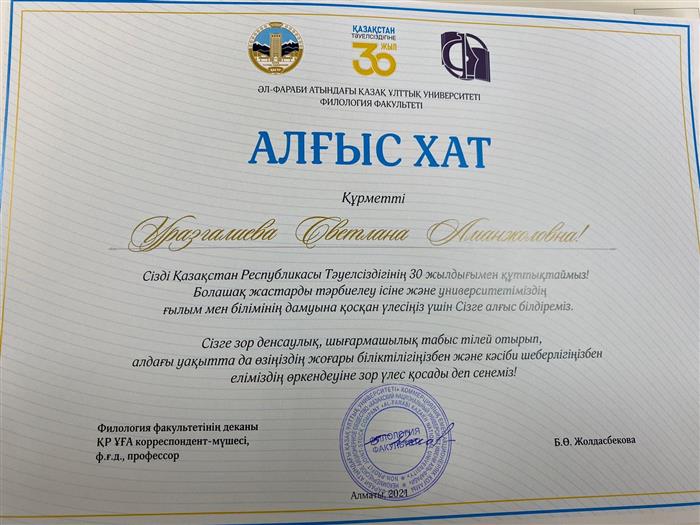 Aisultanova K.A., candidate of philological sciences, the senior lecturer of the Department of Foreign Languages of the Faculty of Philology was awarded a letter of thanks by the initiative of Tuimebayev Zh.K., the Rector of Al-Farabi Kazakh National University. |