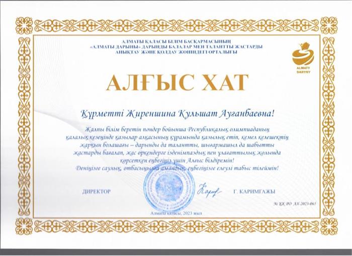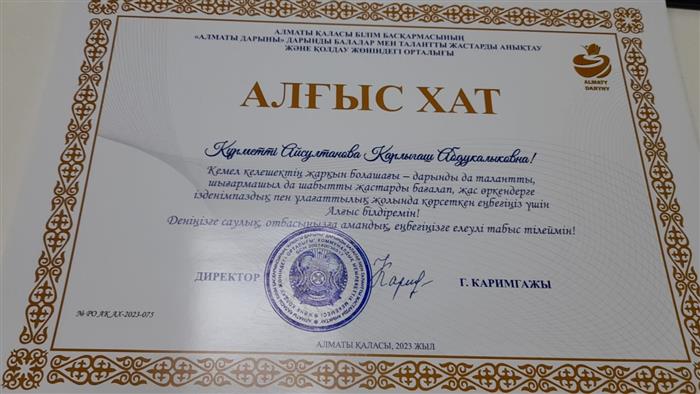 We would like to thank you for your appreciation of gifted, talented, creative and inspired young people, for the work you have shown young people in terms of curiosity and nationalism. Director of the Almaty Daryn Center G.Karimgazhy |