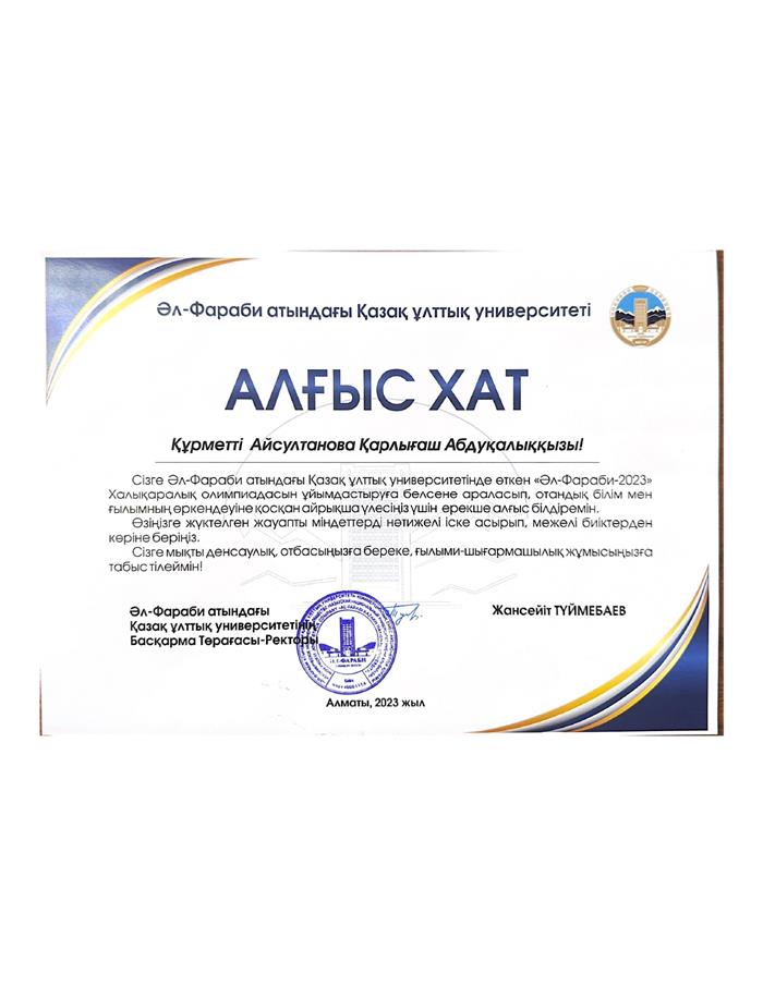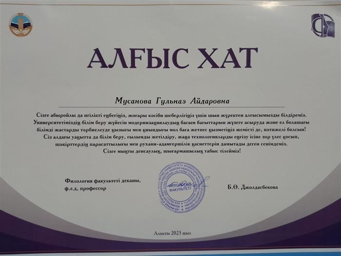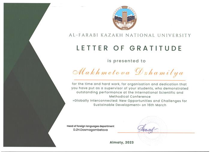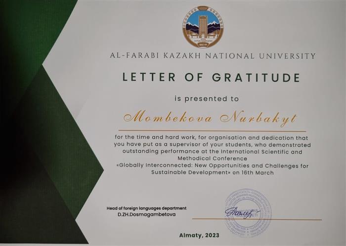 Senior teachers: Muldagaliyeva A.A., Urazgaliyeva S.A., Kulzhanbekova G.A., Gaiipova G.A., Eleubayeva P.K., Kuralova A.T., Makharova G.S., Orazbayeva A.S., Lugovskaiya E.I., Makhmetova D.M., Baurzhan G., Gumarova Sh., Mombekova N., Baimurato I.A. received a letter of gratitude for preparing master's degree students for the international scientific conference: "New Opportunities and Challenges for Sustainable Development". |