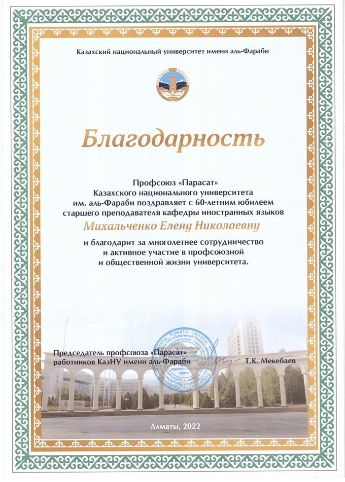 The senior lecturer of the Department of Foreign Languages, Mikhalchenko E.N. was awarded letter of gratitude by Parasat University Trade Union for long service and active participation in the university social life. |