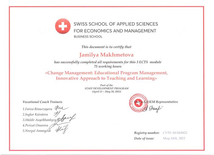 Senior lecturers: Makhmetova D., lecturers Utegenova K., Zhemilyova M. successfully completed 75 hour advanced training courses on the topic: "Change Management: Educational Porgram Management, Innovative Approach to Teaching and Learning" from the Swiss School of Applied Sciences in Economics and Management and received certificates. |
