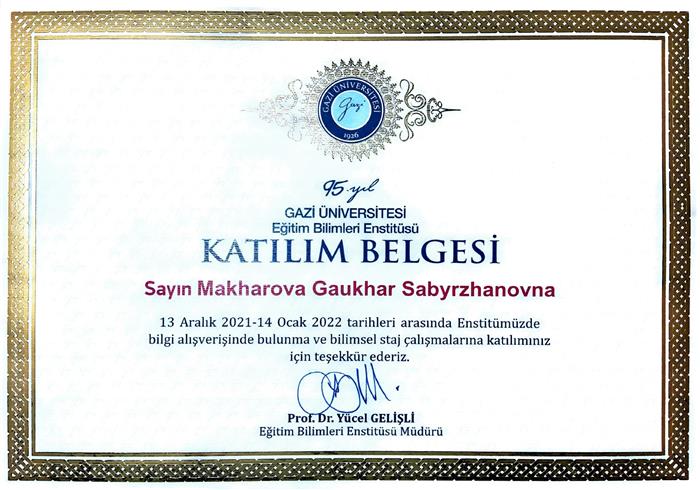 Senior Lecturer of the Department of Foreign Languages Makharova G.S. passed a scientific and methodological internship at the Gazi University of Turkey in the 2021-2022 academic year. |