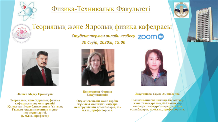 With the participation of teachers and students of the Department of Theoretical and Nuclear Physics of KazNU named after Al-Farabi on April 26 at 14:00 on the Zoom platform was held an educational hour on the topic "The road to a world without nuclear weapons: the Leader’s initiative." Organizers: |