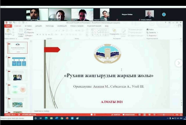 Anapiya Meruert, Utey Shynbolat, Sabidolda Avganbek, 1st year doctoral students of the specialty "8D05308 - Nuclear Physics" of the Department of Theoretical and Nuclear Physics of Al-Farabi Kazakh National University held an open lesson on the topic "Рухани жаңғырудың жарқын жолы".