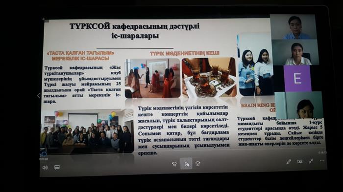 During the meeting, the head of the department U.T. Kydyrbaeva, deputy head of the department for teaching and methodological and educational part K.B. Zhanataeva, deputy head for scientific and innovative work and international relations E.A. Montanay introduced first-year students admitted to the department by the teaching staff and the work process of the department. In the course of online meeting, the students were informed that due to the current pandemic situation in the country, distance learning will be conducted from September 14 this year. At the meeting, students were introduced to the achievements of the department, international relations with foreign universities, academic policy and students’ life.
