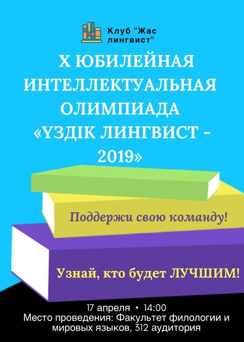 On April 17, 2019, teachers of the Department of General Linguistics and European Languages of the Faculty of Philology and World Languages together with the «Zhas Linguist» Club and undergraduates of 1-2 courses of the specialty Linguistics hold the X anniversary Republican Intellectual Olympiad «Үzdіk Linguist – 2019» in honor of the 85th anniversary of our university.