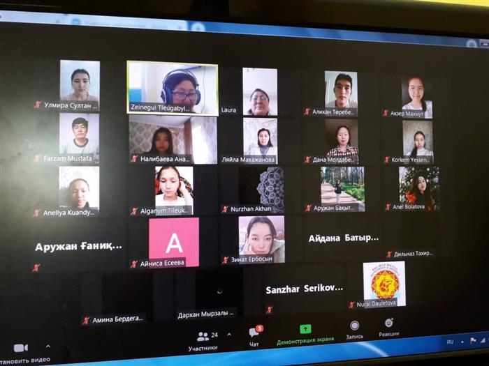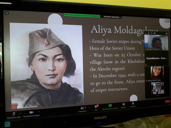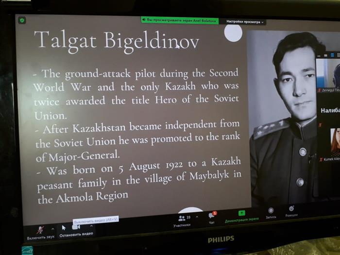 April 30, 2021 at 17.00 senior teachers of the Department of Foreign Languages L.M. Aliyarova, A.O. Bekalaeva, L.M. Makhazhanova, Z.A. Tleugabylova. and a researcher at Nazarbayev University, Eselbaev Rauan Batyrovich, held an on-line event "Memory of the People!", dedicated to May 9, the 76th anniversary of the victory of the Soviet Union in World War II. The meeting was held with the participation of 1st year students in three languages: Kazakh, Russian and English.