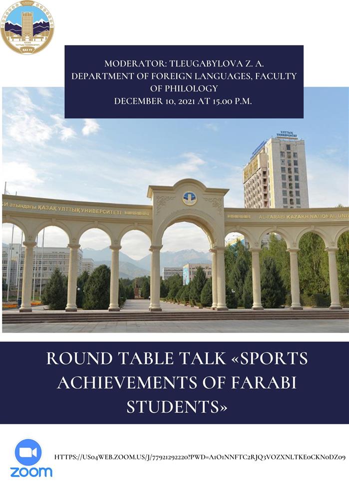 On December 10, 2021 senior teachers of the Department of Foreign Languages Tleugabylova Z.A., Bekalaeva A.O., Makhazhanova L.M. and Bakasova A.N. teacher of Pavlodar Pedagogical College after B. Akhmetov held a round table talk "Sport achievements of Farabi students". The event was held within the framework of the “Healthy Body Cult” project with the participation of 1st year students.