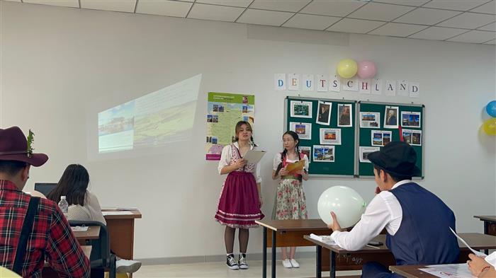 On April 8, 2022, Zhirenshina K.A., the senior lecturer of the Department of Foreign Languages of the Faculty of Philology together with the 3rd year students of the Faculty of History, Archeology and Ethnology held the educational event "Eine Reise durch Deutschland!" in German. The students invited their tutors, as well as, the coordinator of their major, associate professor. The students’ presentations in German about Germany, Berlin and its sights opened the event. Then the students held a quiz in German on the topic: "What do I know about Germany?". The event program also included the presentation: “Heinrich Heine – der größte Dichter Deutschlands” presented by Adil, and the recital of the poem “Lorelei” by students Anara and Tokhtarbek. One of the students performed the musical compositions by the famous German composers. The event ended with the song "Sonnenkreis".