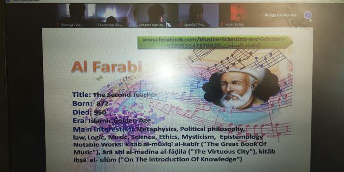 Today the 1150th anniversary of the great teacher and thinker of the East, Abu Nasr Al-Farabi is celebrated all over the world. However, for Kazakhstan, the great thinker’s homeland, this date is of a great significance. Therefore, on November 27, 2020, on the ZOOM platform, within the framework of "Brighten the corner where you are" project, the senior lecturer of the Department of Foreign Languages, Candidate of Philological Sciences, "Lingua" club leader, Aisultanova K.A. held an educational event on the topic: " Al-Farabi’s legacy." The event was held with the 1st year students of the Faculty of Philosophy and Political Science, specialty "Islamic Studies". The purpose of the event was to introduce students to Abu Nasr Al-Farabi’s invaluable and vast heritage.