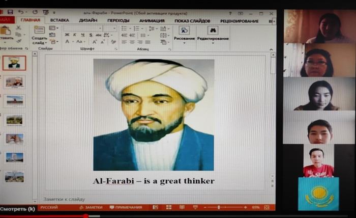 On October 26, 2020, on the occasion of Abu Nasyr al-Farabi`s 1150th anniversary, the world famous thinker, philosopher, sociologist, mathematician, physicist, astronomer, botanist, linguist, logic, musician, the meeting of the «English time» club was held on the topic "al-Farabi - a great thinker", organized by the senior teachers of the department of Foreign languages Akylova G.S. and Duysenbaeva Sh.S.