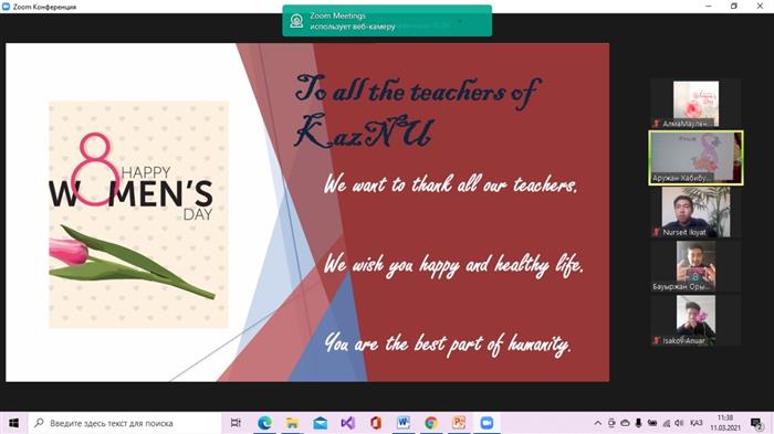In accordance with the plan of the educational work of the university, on March 7, 2021, the teachers of the Department of Foreign Languages U.B. Adilbaeva and G.A. Gaiipova held festive event dedicated to the spring holiday, March 8, with the students of the Faculty of Information Technology.