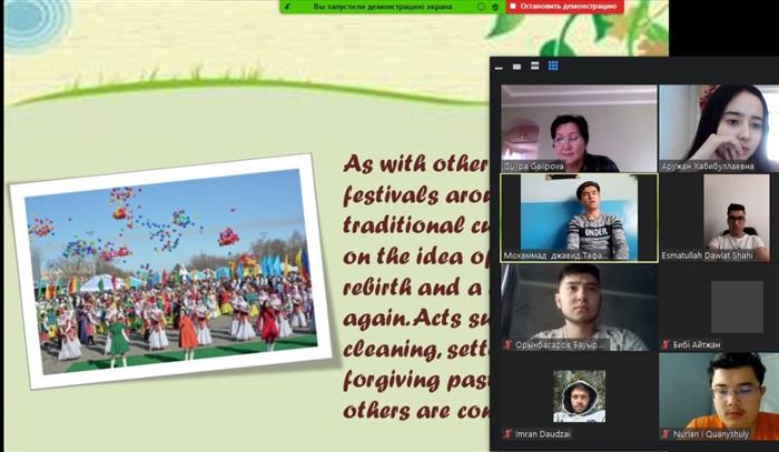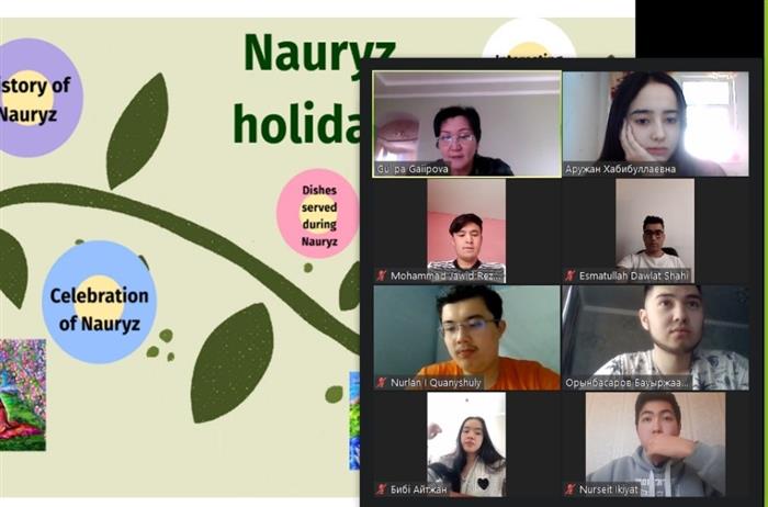On March 26 2021, Associate Professor of the Department of Foreign Languages of KazNU, candidate of Philology U.B. Adilbayeva and senior lecturer G. A. Gaiipova organized an educational event "Nauryz Meirami". The event was attended by the first-year students of the faculty of Information Technology and students from Afghanistan studying at our university. First-year students Khabibullaeva Aruzhan (Kazakhstan) and Esmatulla Davlat Shahi (Kabul) prepared presentations about Nauryz meirami in Kazakhstan and Afghanistan on the ZOOM platform, all other participants discussed the differences and similarities of the holiday of these two countries.