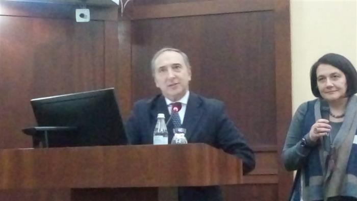 Meeting with the Ambassador of Italy Pasquale D'Avino in Kazakhstan in the main building of the University KazNU. Translates professor Lucia Beltrami, teacher of Italian language of the Department of Diplomatic Translation.