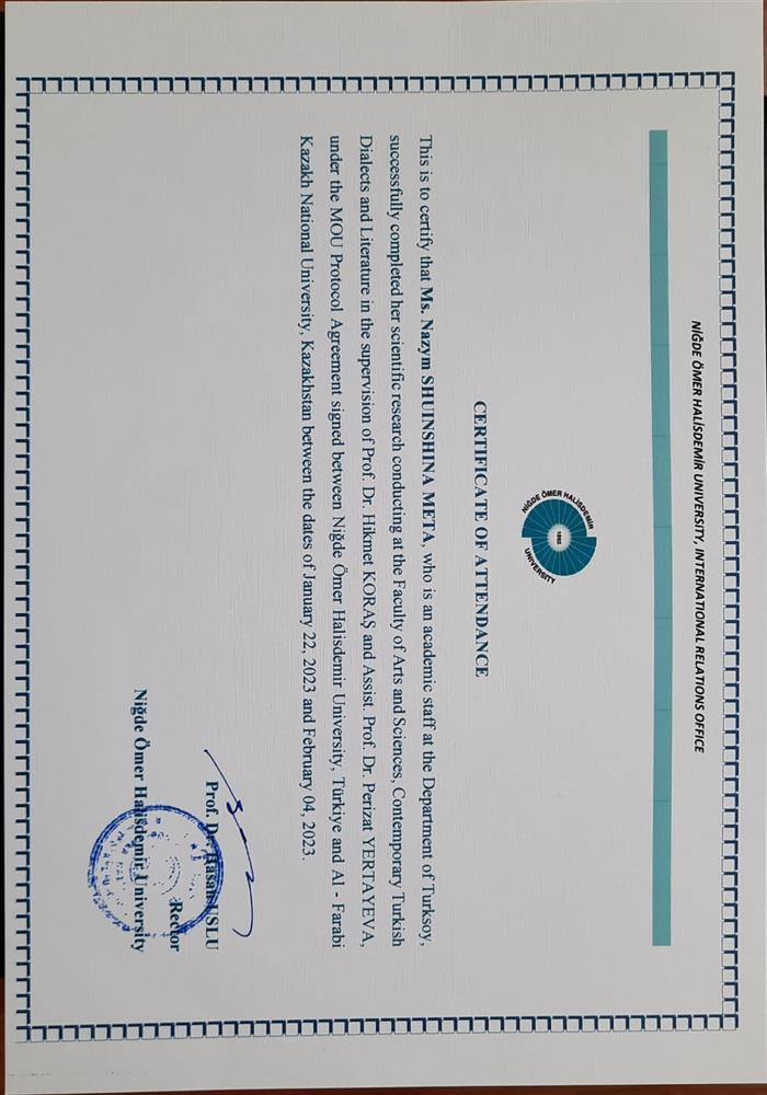 Senior lecturer of the Turksoy Department of the Faculty of Oriental Studies Nazym Shuinshina Meta from 22.01.2023 to 04.02.2023 upgraded her qualifications at the Department of Modern Turkic Languages and Literature of the University of Nıgde Omer Halisdemir in Nigde city, Republic of Türkiye.